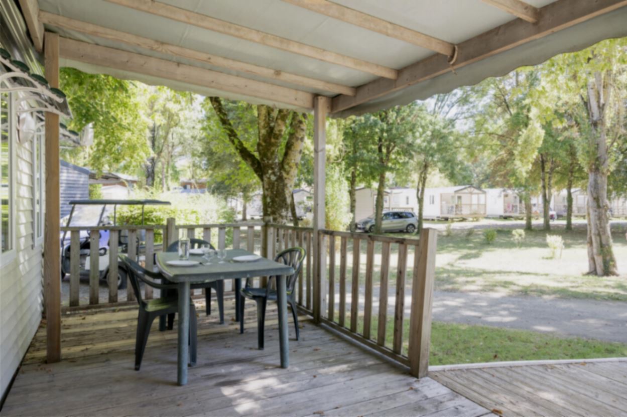 Extérieur : terrasse semi-couverte avec salon de jardin.