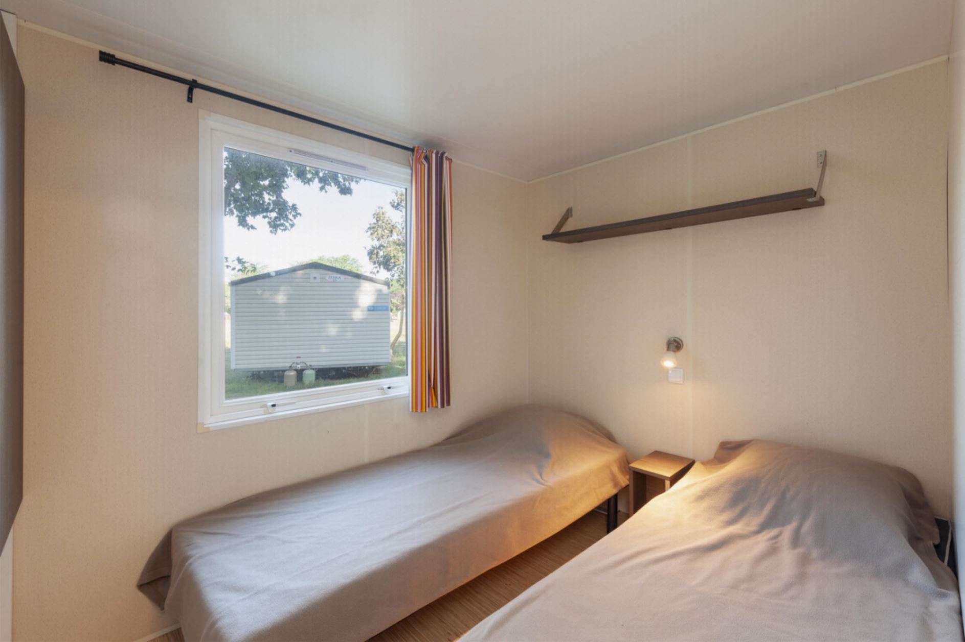 Sleeping area: one bedroom with 1 double bed, one bedroom with 2 single beds side by side, pillows and blankets provided.